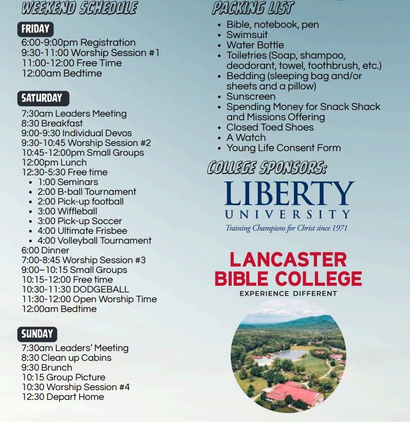 Upon registration, you will receive a confirmation email. We have moved to online payments ONLY! All registrations after April 1st will incur a $25 late fee. At the beginning of April, you will receive an email with the official leaders guide that will include the schedule and other detailed information for the weekend.